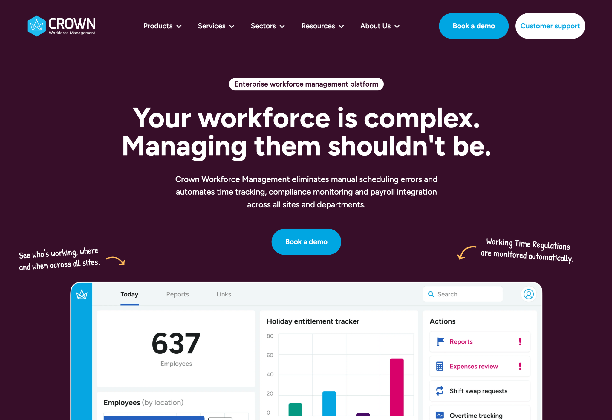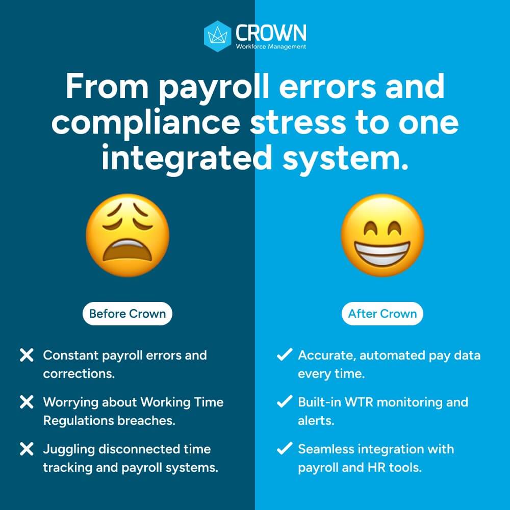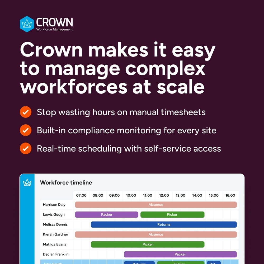 Crown Workforce Management provides workforce management solutions to large enterprises and complex organisations, focusing on industries with intricate shift patterns, time and attendance tracking, and compliance needs.